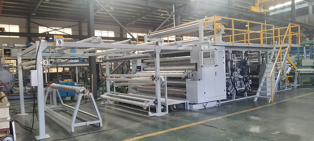 Our hot melt laminating machine is mainly consisted of fabric rewinding and unwinding units, fabric and film transmission systems and tension controller, film unwinding and lining or film carrier rewinding device, hot melt glue melting unit (optional), pump (optional), conduction oil source system (optional), glue dot transfer unit, laminating device, cooling device, PLC and other devices.